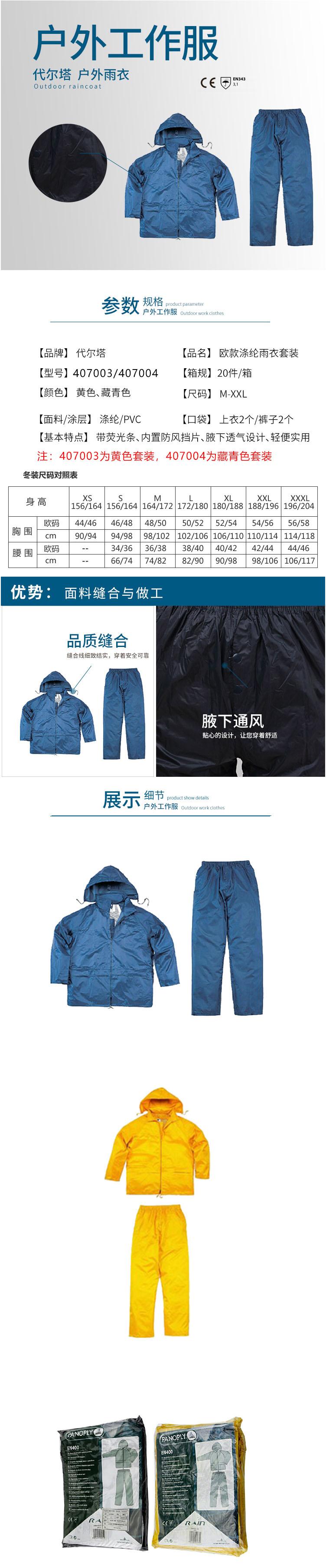 產(chǎn)品描述:雨衣套裝,分為上衣和褲子。接縫處縫合且粘牢密封。上衣帶帽子和帽帶。帶有拉鏈。內(nèi)有防風(fēng)帽邊。套袖帶有按扣式袖口。袖孔處有通風(fēng)口。背部垂邊可透氣。2個帶有沿邊的口袋。褲子帶腰帶。褲腳帶按扣。 2個開口式口袋。