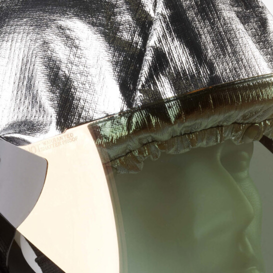 頭盔外殼為玻璃纖維材料,優(yōu)異的耐高溫性能和耐化學(xué)物質(zhì)性能;外側(cè)為3層PBI/Kevlar 鍍鋁隔熱材料,使用魔術(shù)搭扣與頭盔連接; 6英寸鍍金面屏,符合NFPA1976標(biāo)準(zhǔn)要求,表面有防刮擦涂層;柔軟襯墊,6點(diǎn)式減震系統(tǒng)使得穿戴更加舒適;可配合空氣呼吸器使用。
